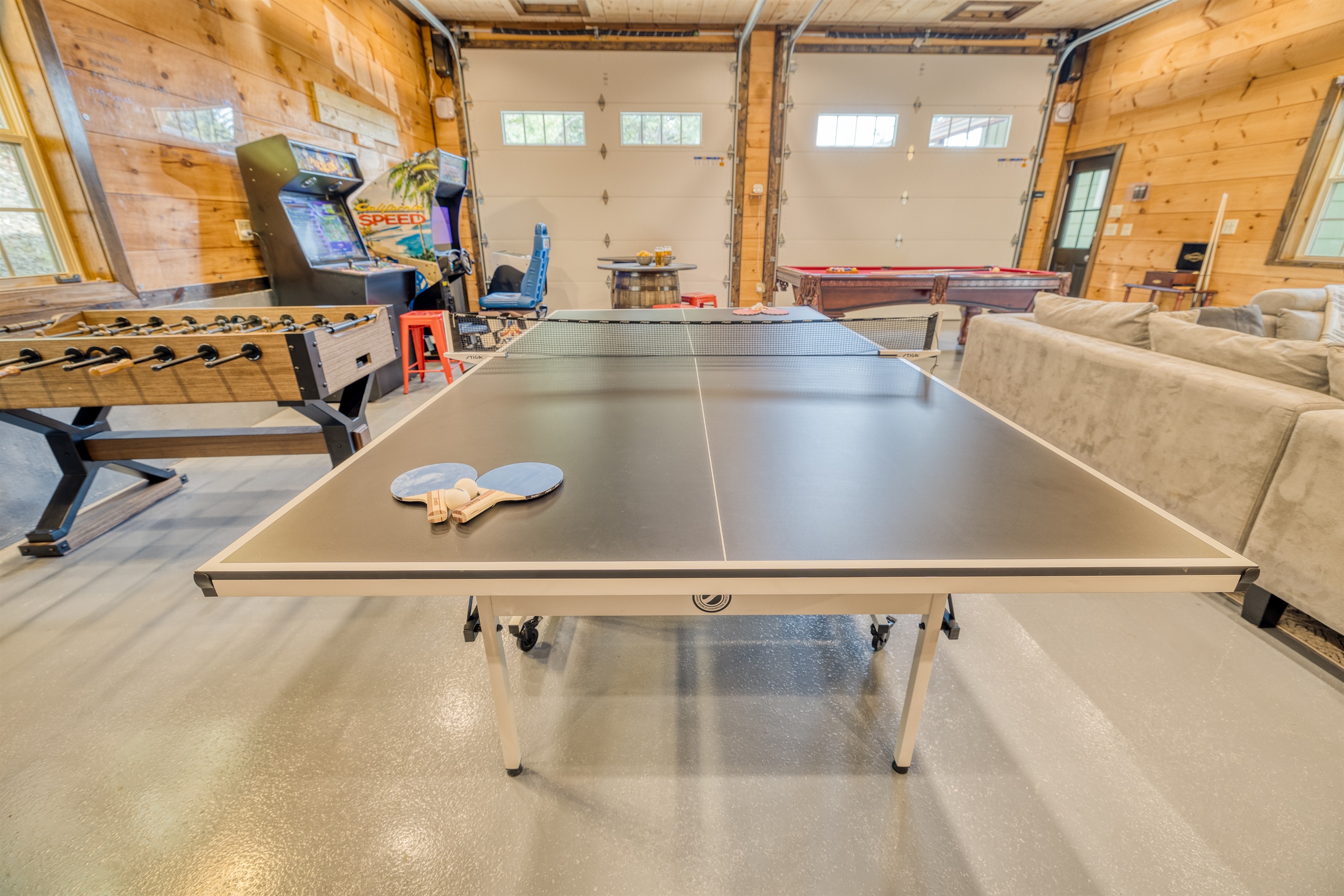 The detached, finished garage is the ultimate mancave with a massive 1200 sq ft arcade and private 800 sq ft apartment above. What a luxury vacation experience!! The arcade features a pool table, air hockey table, foosball table, 1300 game multicade AND driving arcade game! Take a break from the competition and enjoy the 65 inch smart TV.
